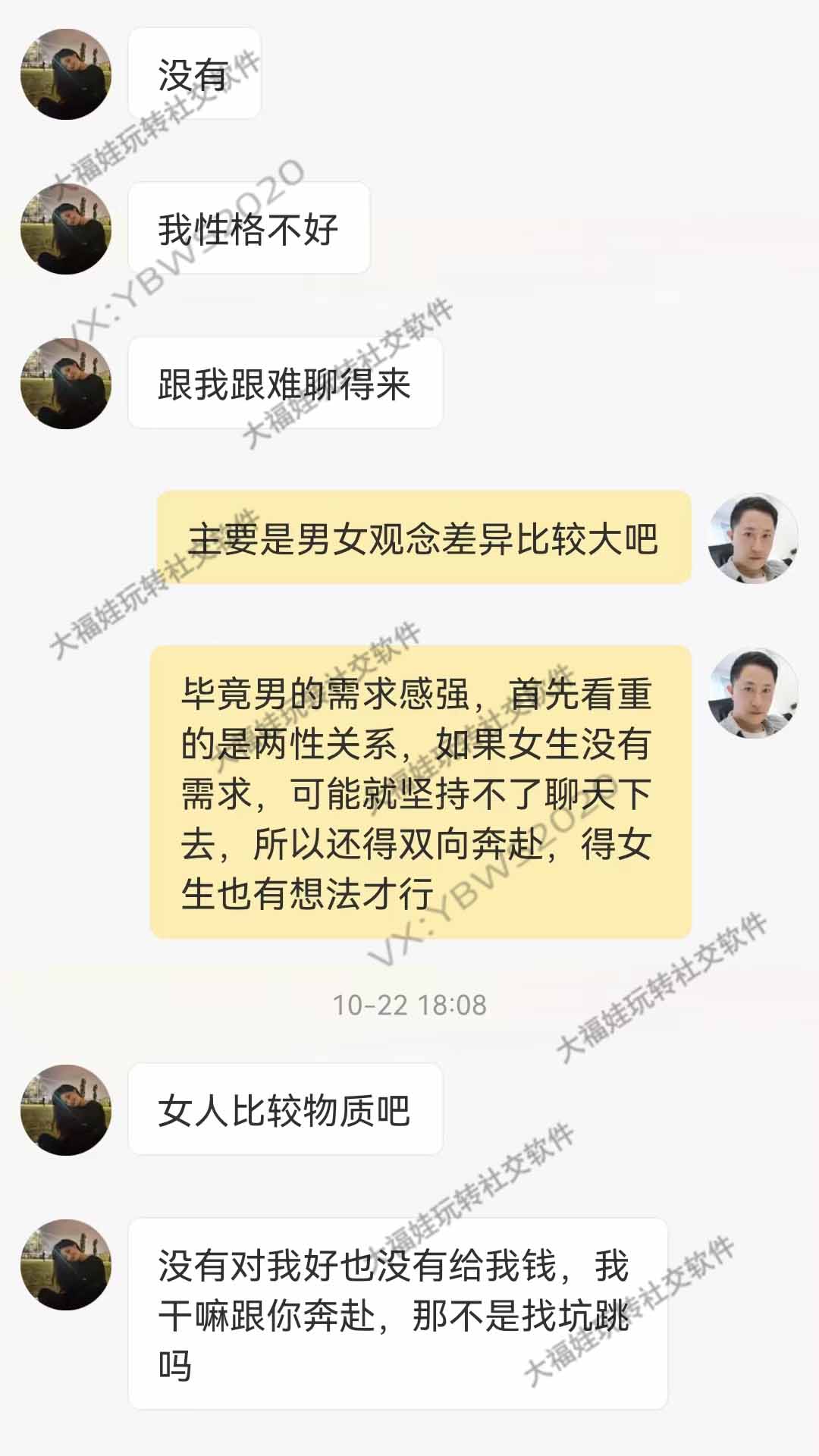 女:没有 / 我性格不好 / 跟我很难聊得来
