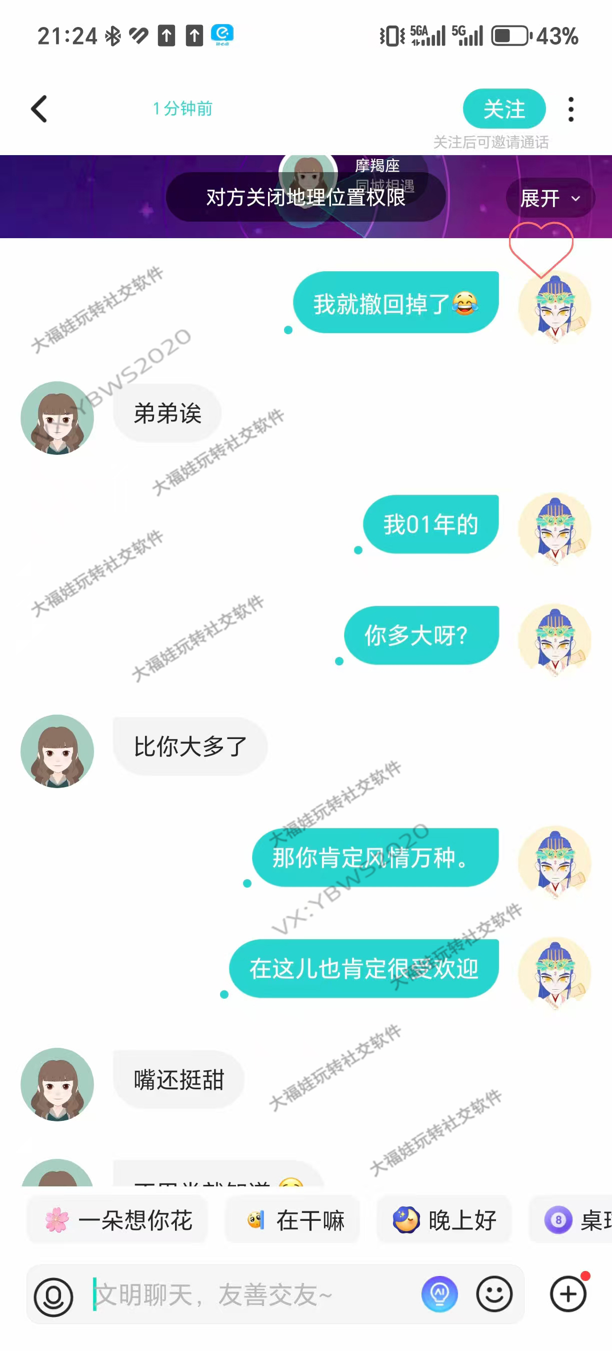 - 年龄调侃 + 高情商夸赞:「我 01 年的」+「那你肯定风情万种,在这儿也肯定很受欢迎」