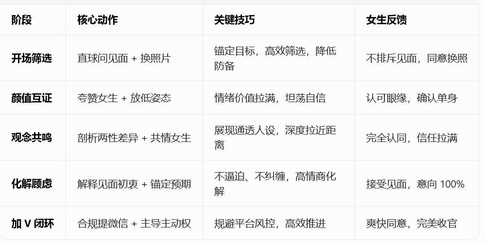 这套聊天是 「直球锚定见面预期→颜值互证建立信任→两性观念深度共鸣→化解见面顾虑→合规加 V 闭环」的完整高成功率框架。 核心是坦诚 + 通透 + 目标明确 + 高情商共情 **,全程不尬聊、不油腻、不跪舔,精准抓住女生「无效聊天排斥、观念同频需求」,从陌生到加微信,一步到位。